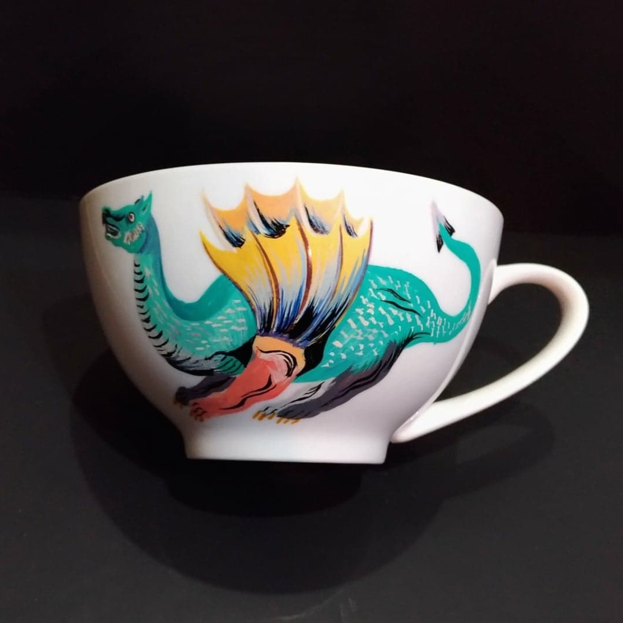 ハンドペイントによるDRAGON柄の大きめコーヒーカップ。朝食のシリアルや、スープにもGOOD。裏側にはヤシの木が描かれています。