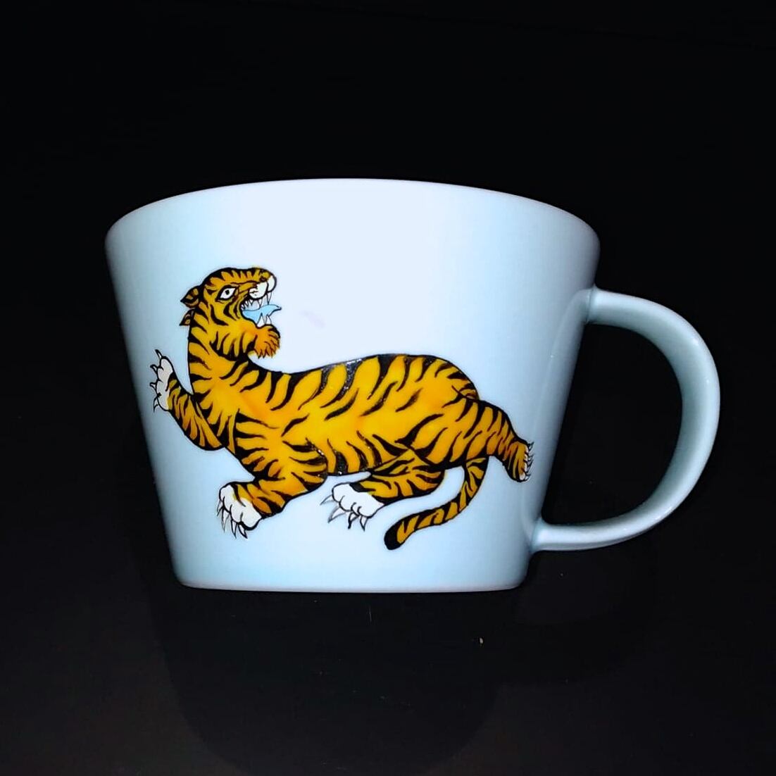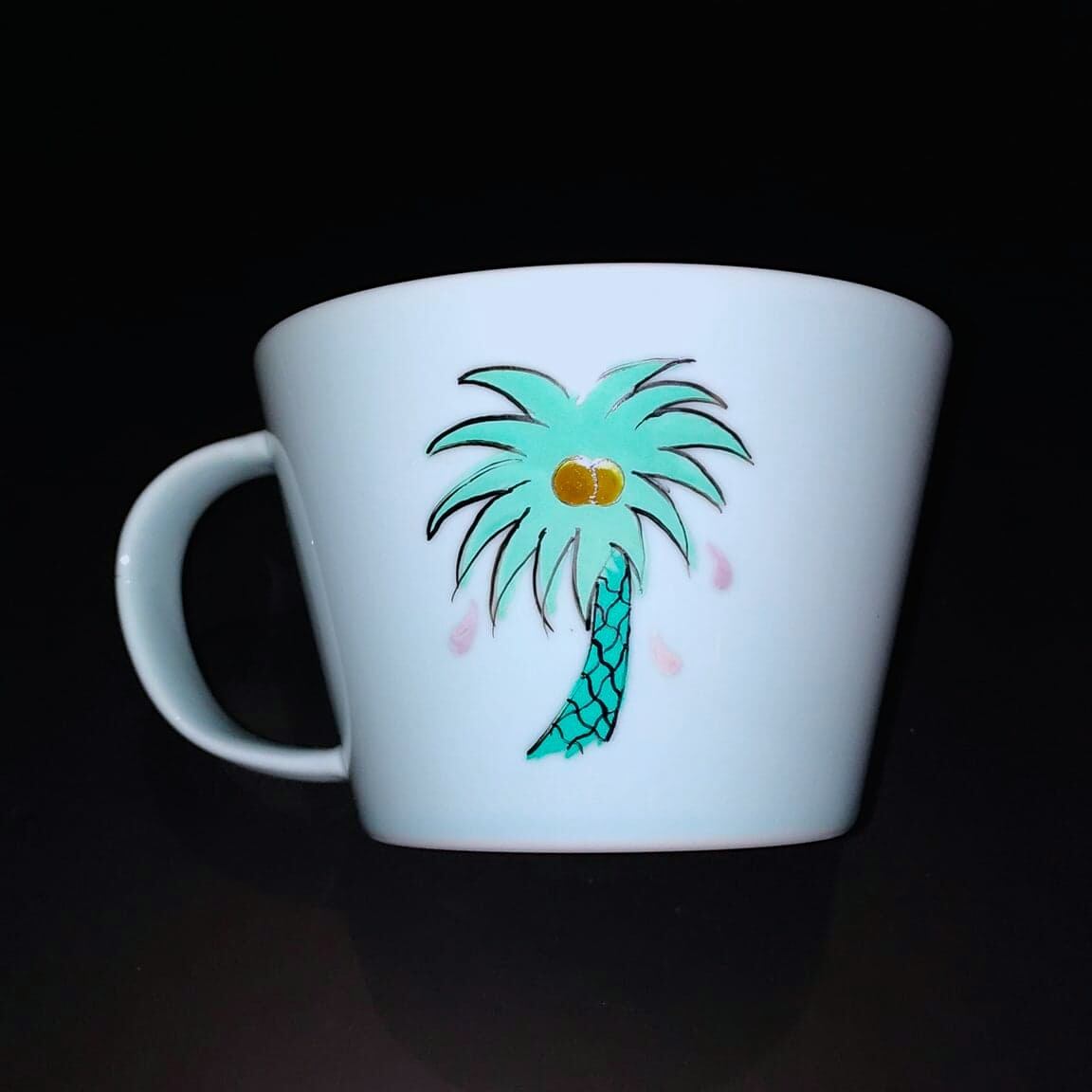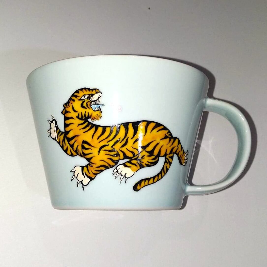 ハンドペイントによるTIGER柄マグカップ。BODYは淡い水色。裏側にはヤシの木が描かれています。