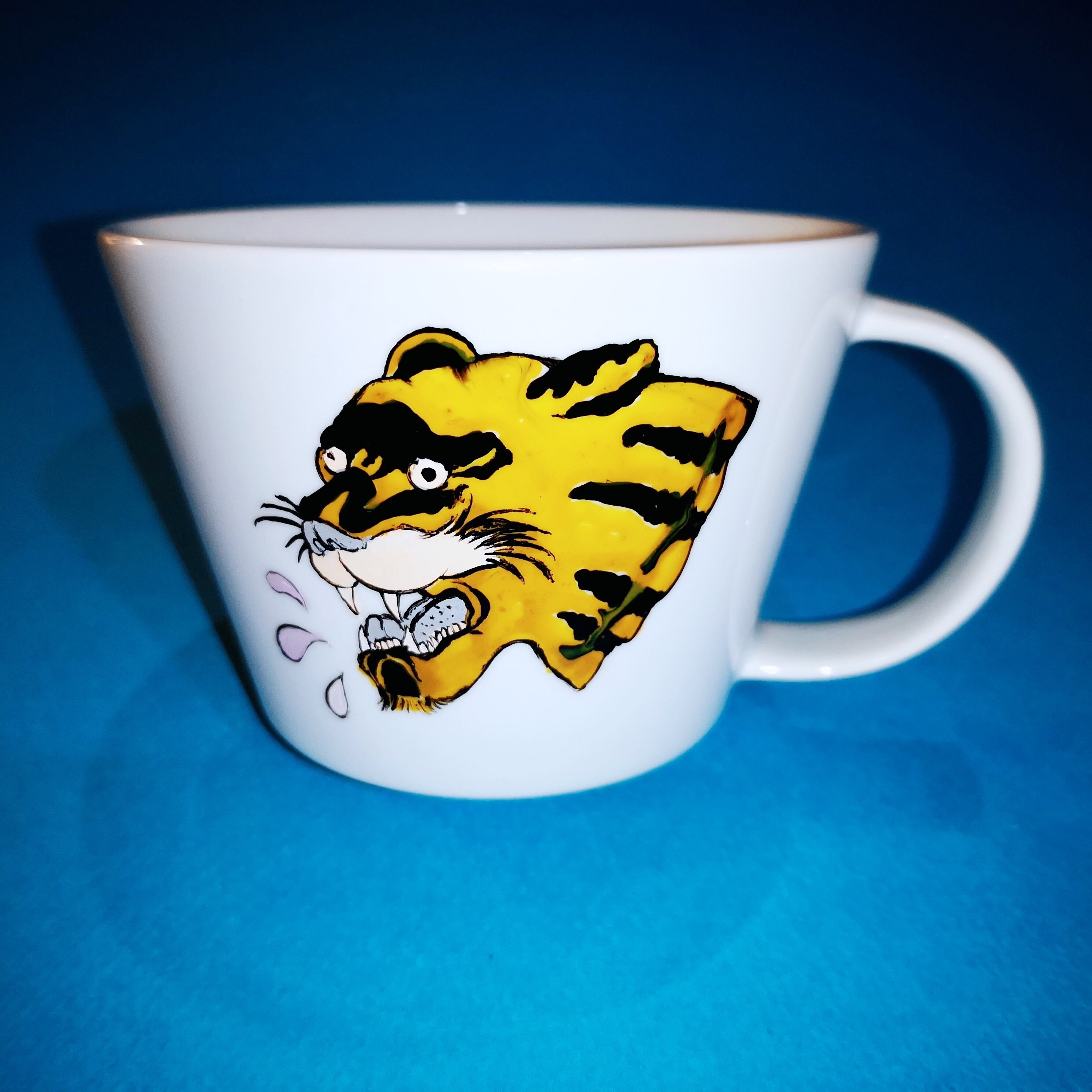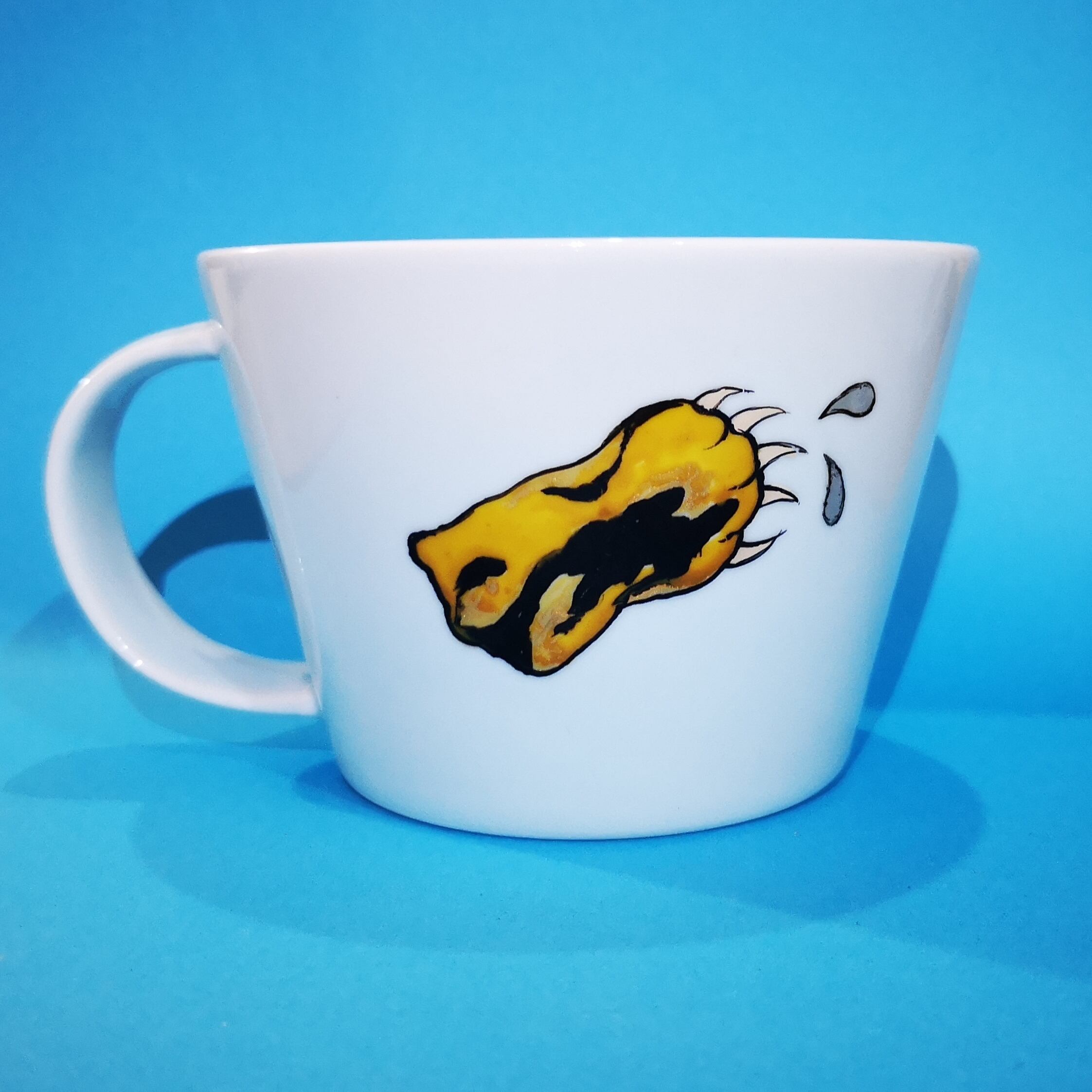 ハンドペイントによるパンサー柄マグカップ。裏側にはヤシの木が描かれています。BODYは淡い水色になります。